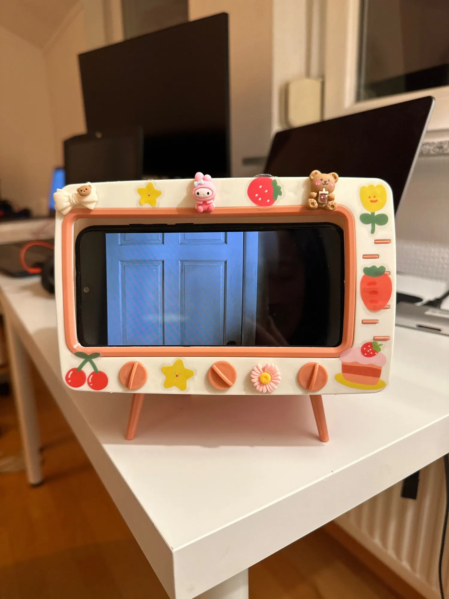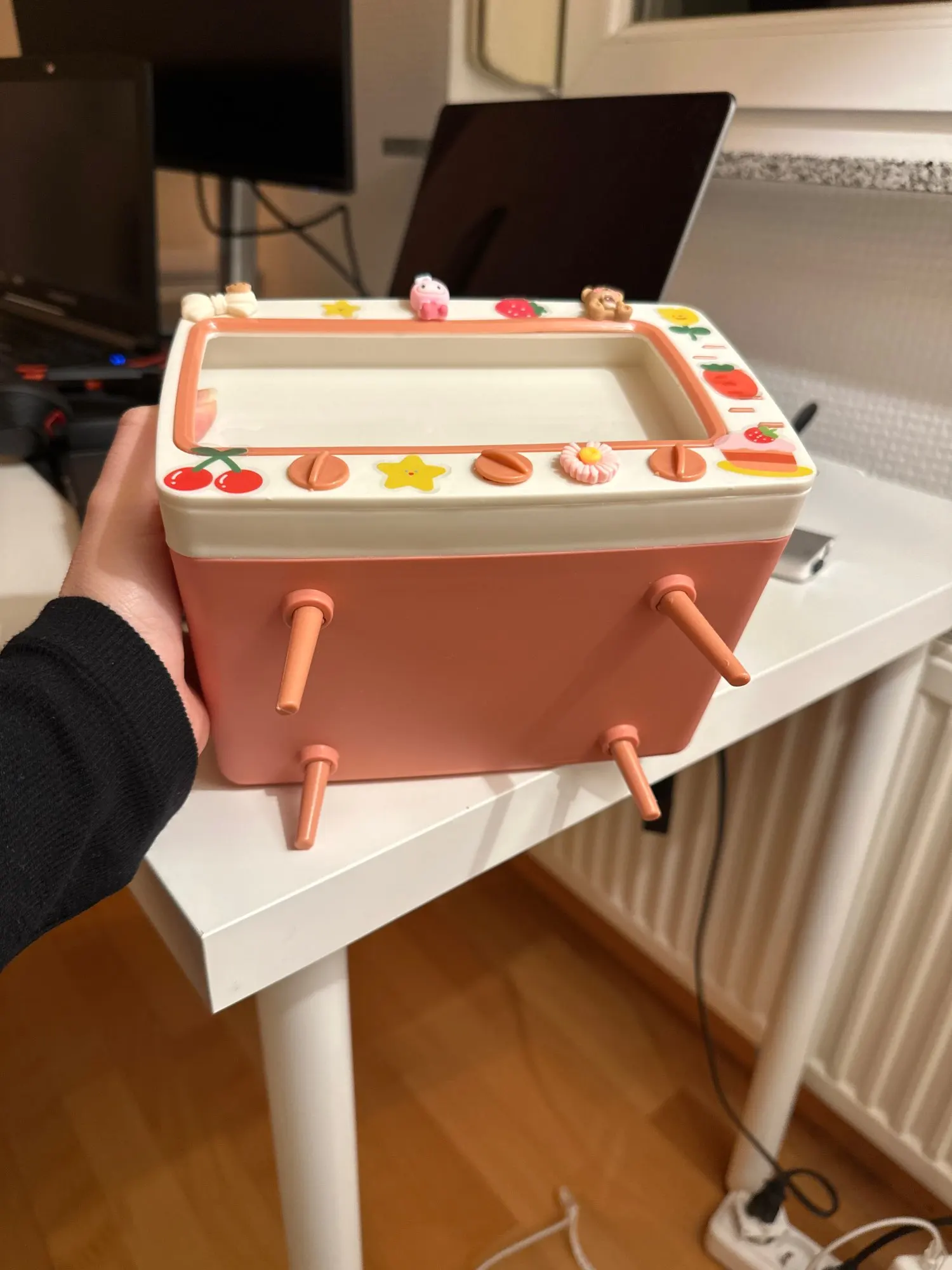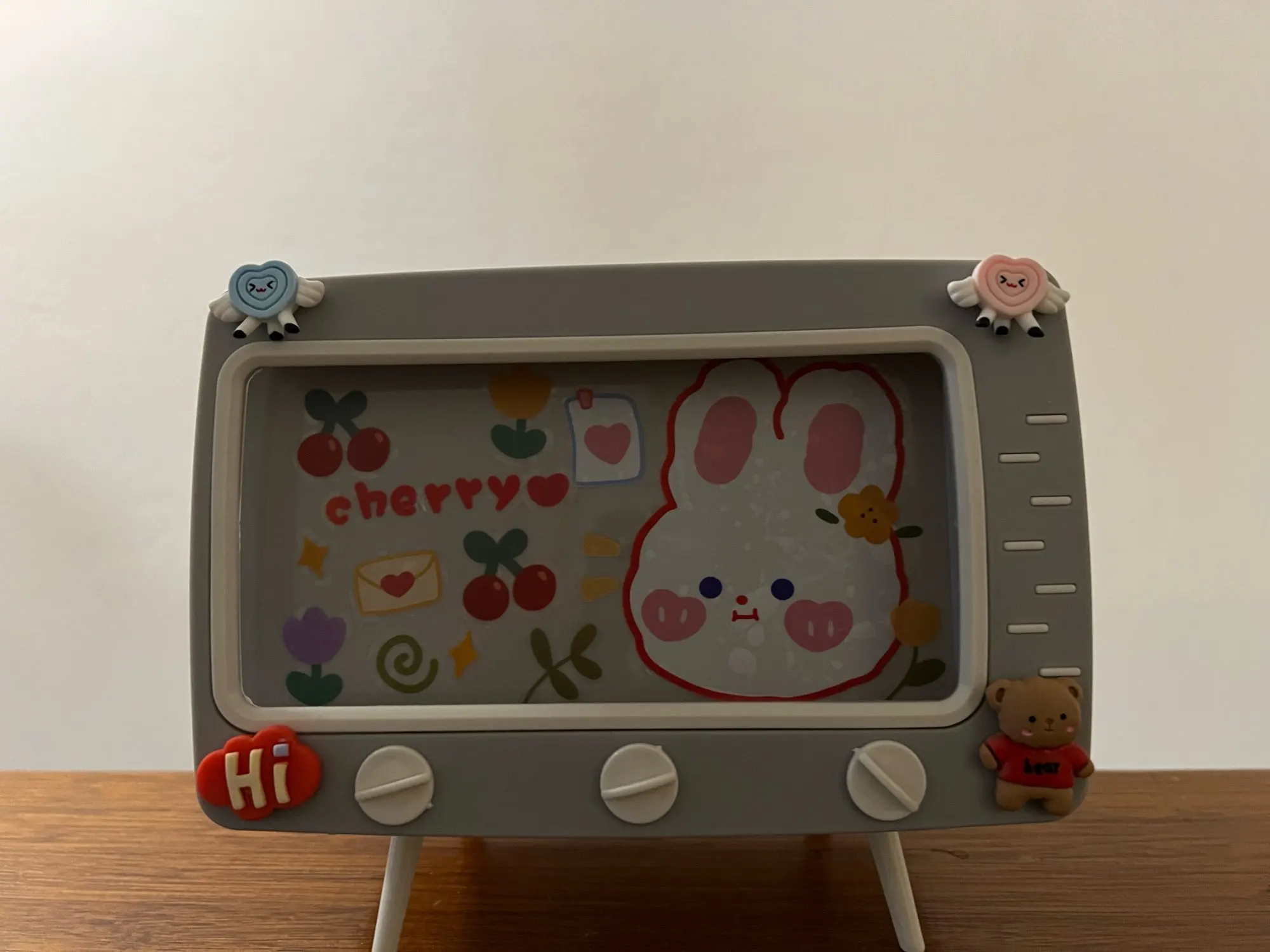 It came with cute stickers that you can decorate with! If you have a thicker protective case (mine had thick corners) you might have to take it off to fit the phone in the box.